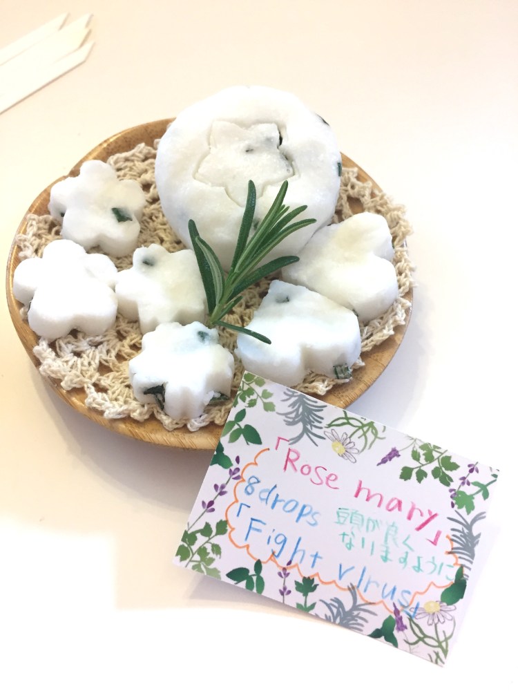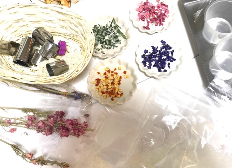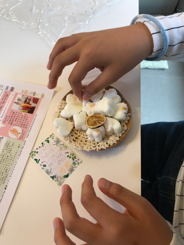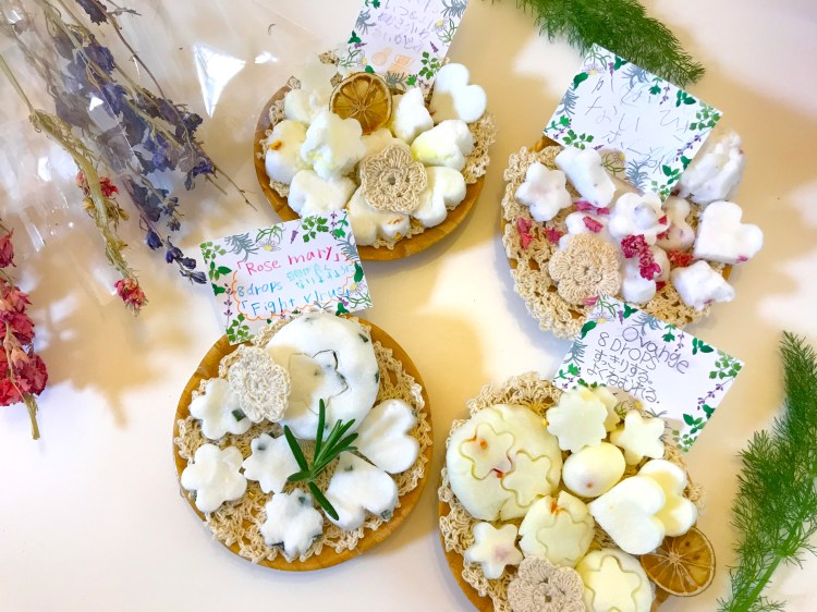 お待ちかね手作りタイムでは、ハーブを加えた石けんに好きな精油を選んで、手でこねます。