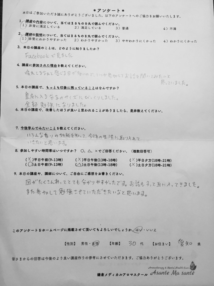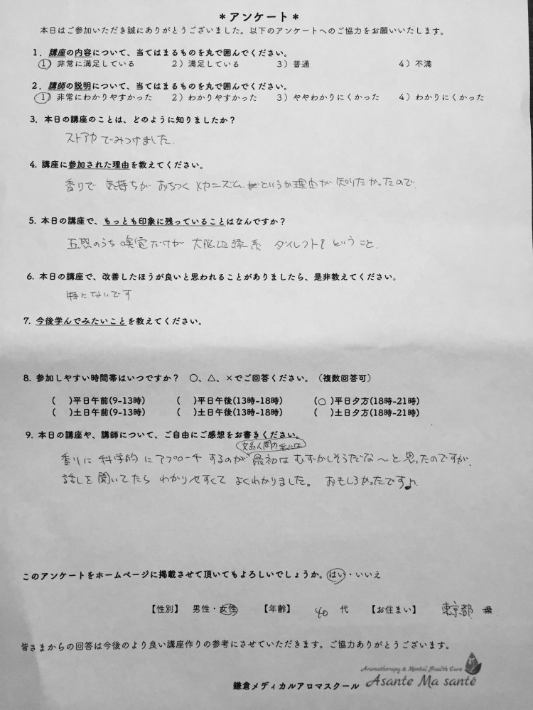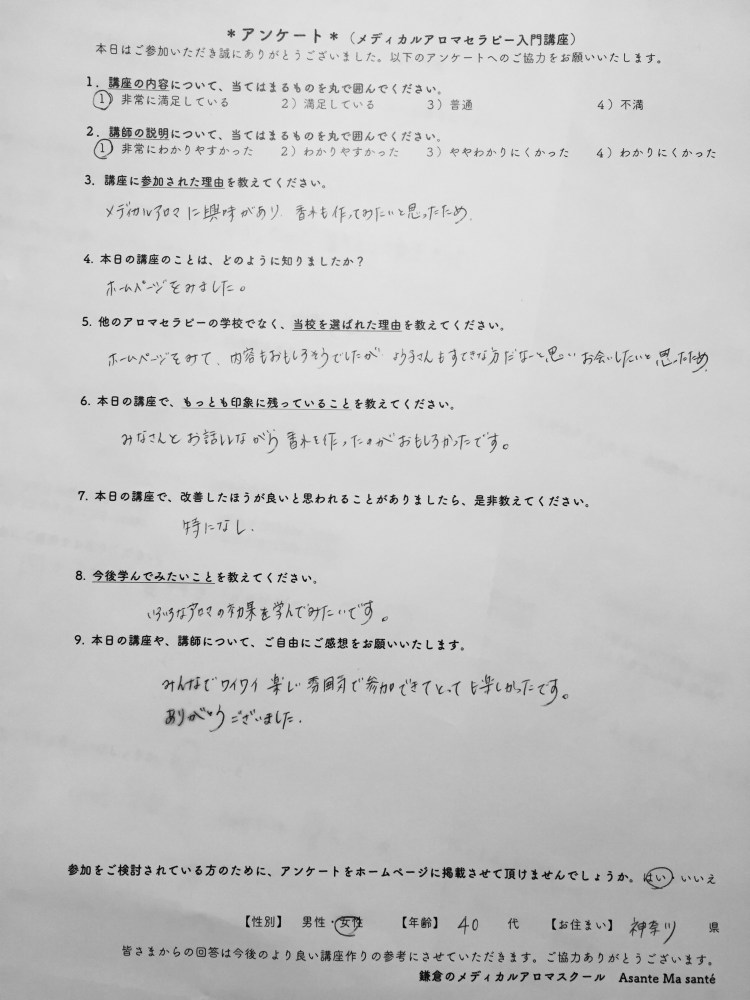 実は、アンケートだけでなく、講座が終わってからも、作製したクラフト(バスオイル、練り香水、トリートメントオイル)に助けられた!受講して良かった!という嬉しいメッセージや、追加購入のご連絡も多数頂いております。