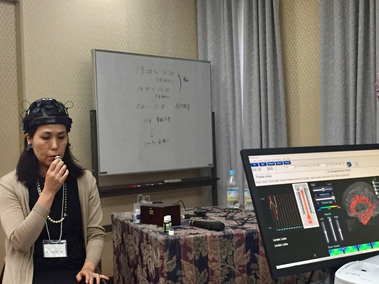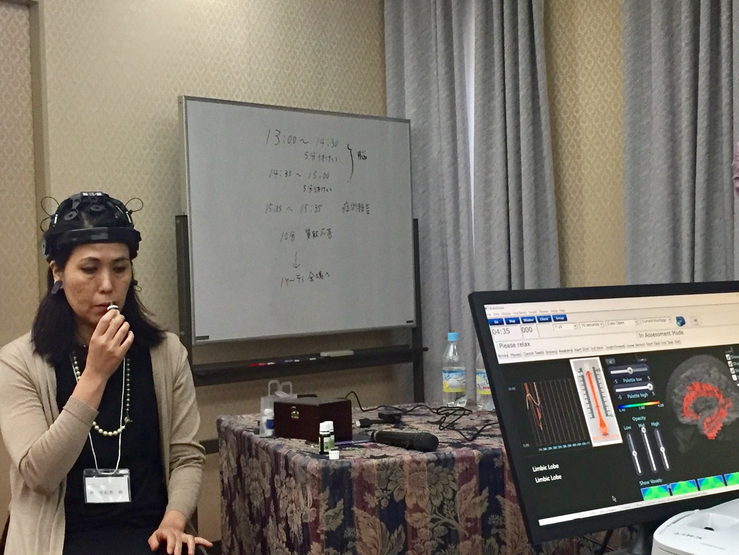 実際に、好きな香りと嫌いな香りの精油を嗅いだ時、海馬や帯状回における脳波(アルファ波)の活動電位が、赤や青に変化し、嗅覚刺激がビジュアルで見えることに感動しました!