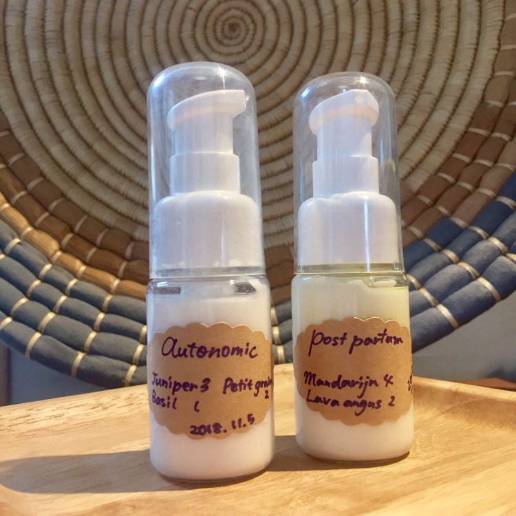 ついでに、私も、産後の入院中は、赤ちゃんのオムツ替えや授乳で手洗いの頻度が多いと聞いたので、リラックス作用や誘眠作用のある大好きな香りで、お揃いのボトルで作りました💓