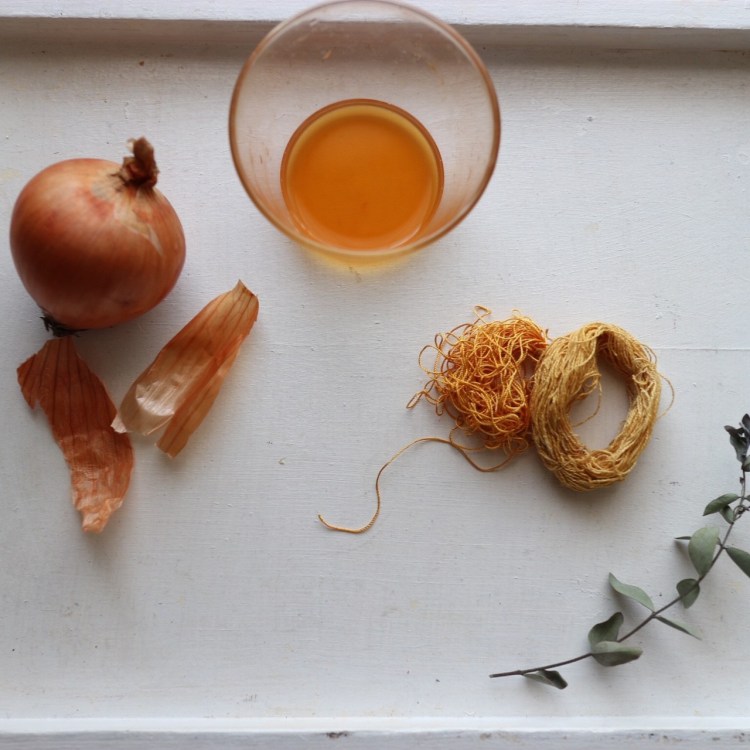 葉っぱは、藍とウコンの重ね染め、実はタマネギ染め。