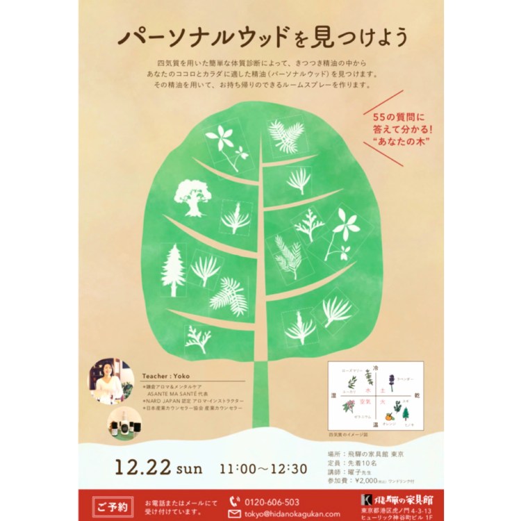 四気質を用いた簡単な体質診断によって、きつつき精油の中から、あなたのココロとカラダに適した精油(パーソナルウッド)を見つけます。