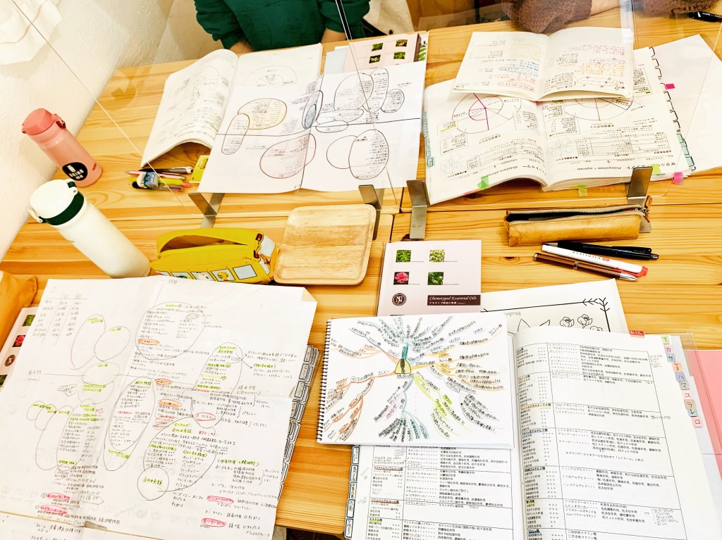 ハーブティーをお淹れしにキッチンに行っている間に、どうやって自宅で勉強しているかお互いのノートを見せ合っていらっしゃって、ぎっしりと書き込まれた電子座標系や成分円グラフから、皆さんが一生懸命勉強されている姿がひしひしと伝わり感動して、思わずパチリさせて頂きました😊