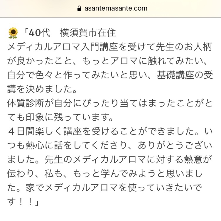 💌「オンラインで精油を使う講座を受けるのは初めてでしたが、内容もわかりやすくパウチされた精油をひとつひとつ嗅いでいくのがとっても楽しくて、時間があっという間に過ぎてしまいました!