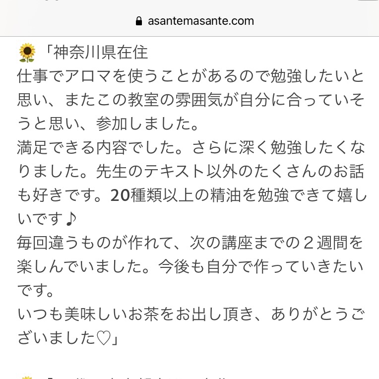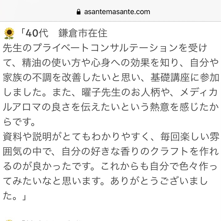 💌「鎌倉までなかなか行けないためオンラインレッスンは手軽に受けられて良かった。優しい雰囲気のインストラクターの方にマダガスカルの歴史や精油の効能を無理ないスピードで教えてもらえた& 試したことない精油の香りをテイスティングでき買いたい精油が判明した。スライドが分かりやすかった& マダガスカルでの栽培地域の情報は面白かった。」