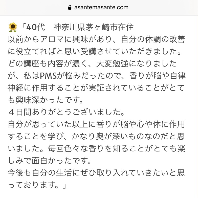 夜に自宅であのような講座を受けるのはとても新鮮でしたし、香りのサンプルや商品のチラシを見ながらだと、一方的に画面だけを見ている感じがしなく、本当に講座に参加して直接先生にお話しを聞いているようでとても楽しかったです♪ 」