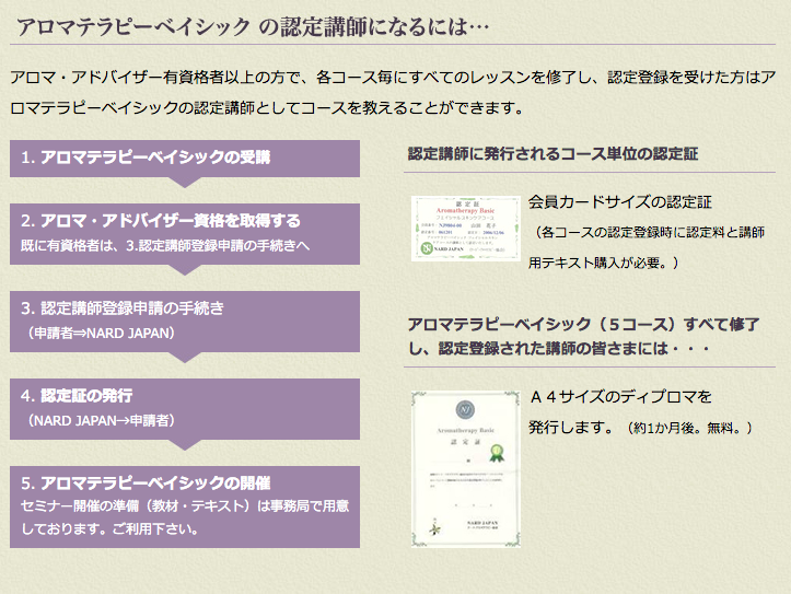 アロマ・アドバイザー資格以上の有資格者で、各コース毎に全てのレッスンを修了し、認定登録を受けた方は、アロマテラピーベイシック認定講師として、認定を受けたコースを教えることができます。
