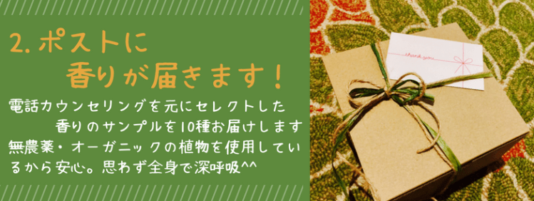 電話カウンセリングの内容を元に、メディカルアロマアドバイザー兼インストラクターの資格を持つ産業カウンセラーがセレクトした香りのサンプルを10種類、郵送でご自宅にお届けします。